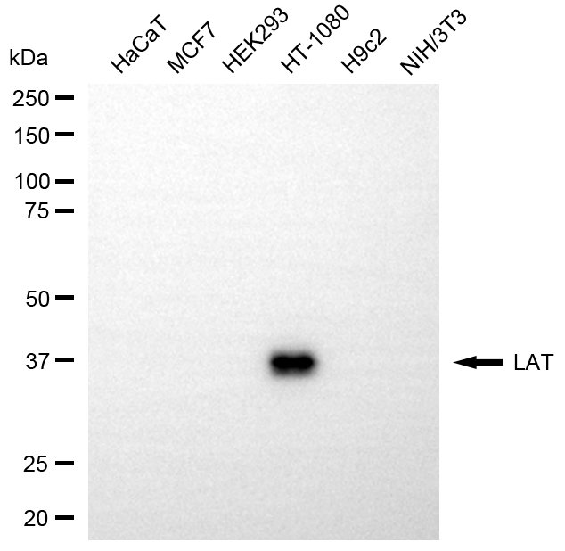 Western blotting analysis using LAT antibody. Total cell lysates (30 μg) from various cell lines were loaded and separated by SDS-PAGE. The blot was incubated with LAT antibody and HRP-conjugated goat anti-rabbit secondary antibody respectively.