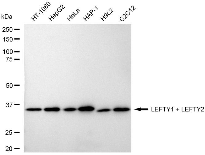 Western blotting analysis using LEFTY1 + LEFTY2 antibody. Total cell lysates (30 μg) from various cell lines were loaded and separated by SDS-PAGE. The blot was incubated with LEFTY1 + LEFTY2 antibody and HRP-conjugated goat anti-rabbit secondary antibody respectively.