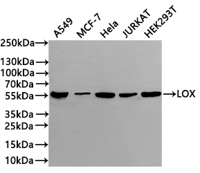 Positive WB detected in: A549 whole cell lysate(20μg), MCF-7 whole cell lysate(20μg),Hela whole cell lysate(20μg), JURKAT whole cell lysate(20μg), HEK293T whole cell lysate(20μg)