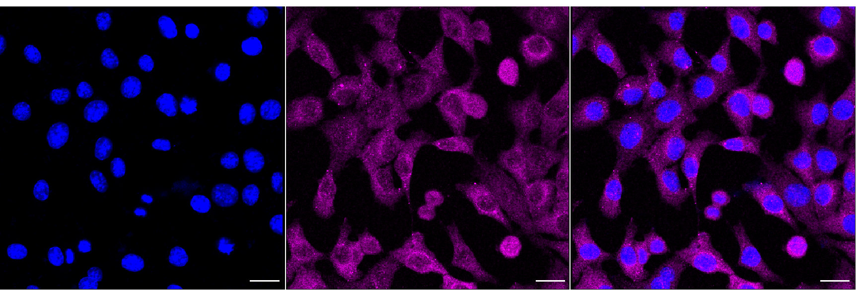 Immunocytochemical staining of C2C12 cells with phospho-MEK1 (S298) antibody. Nuclei were stained blue with DAPI; Phospho-MEK1 (S298) was stained magenta with Alexa Fluor? 647. Images were taken using Leica stellaris 5. Protein abundance based on laser Intensity and smart gain: Medium. Scale bar, 20 μm.