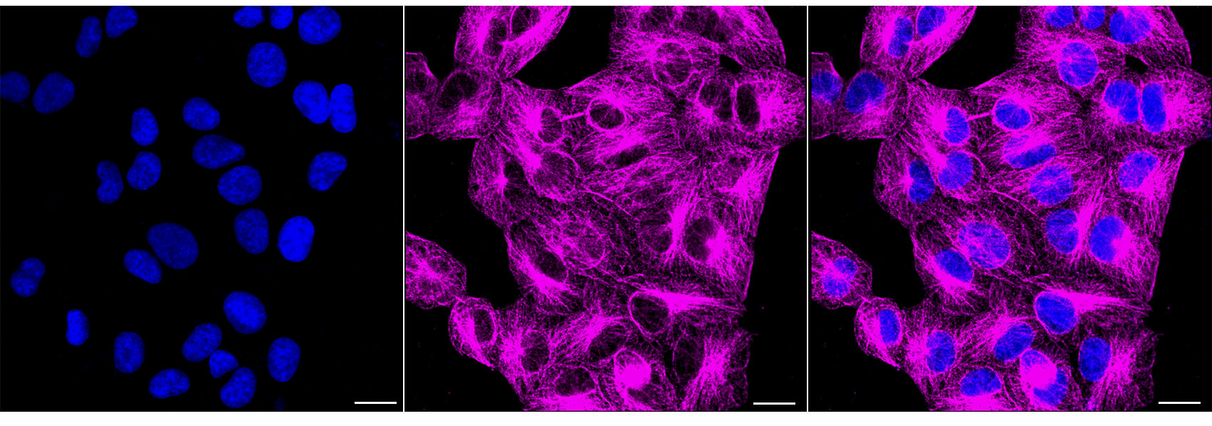 Immunocytochemical staining of HT-1080 cells with JNK3 antibody. Nuclei were stained blue with DAPI; JNK3 was stained magenta with Alexa Fluor? 647. Images were taken using Leica stellaris 5. Protein abundance based on laser Intensity and smart gain: Medium. Scale bar, 20 μm.