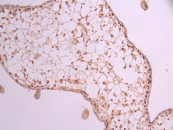 IHC image of CSB-RA261449A0HU diluted at 1:100 and staining in paraffin-embedded human placenta tissue performed on a Leica BondTM system. After dewaxing and hydration, antigen retrieval was mediated by high pressure in a citrate buffer (pH 6.0). Section was blocked with 10% normal goat serum 30min at RT. Then primary antibody (1% BSA) was incubated at 4°C overnight. The primary is detected by a Goat anti-rabbit polymer IgG labeled by HRP and visualized using 0.05% DAB.