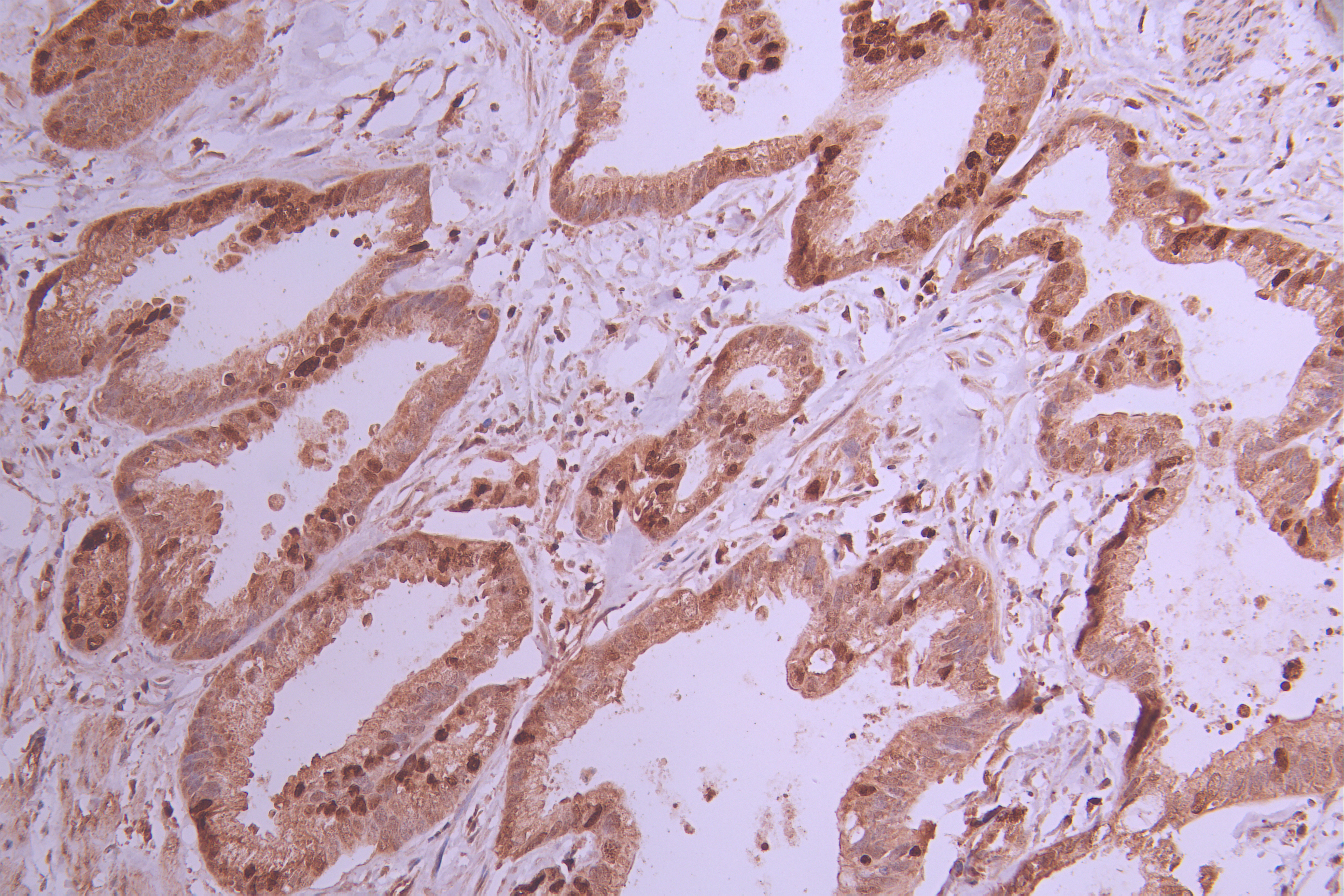 IHC image of CSB-RA986091A0HU diluted at 1:100 and staining in paraffin-embedded human cervical cancer performed on a Leica BondTM system. After dewaxing and hydration, antigen retrieval was mediated by high pressure in a citrate buffer (pH 6.0). Section was blocked with 10% normal goat serum 30min at RT. Then primary antibody (1% BSA) was incubated at 4°C overnight. The primary is detected by a Goat anti-rabbit polymer IgG labeled by HRP and visualized using 0.05% DAB.