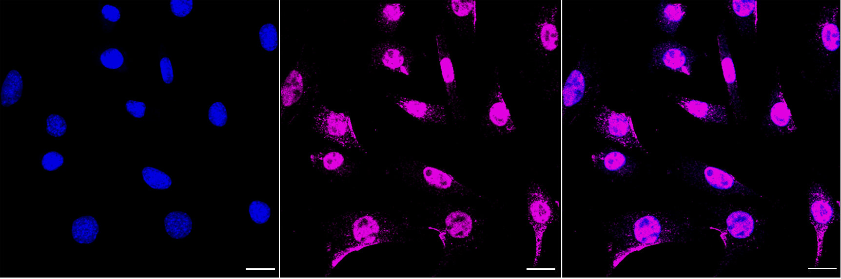 Immunocytochemical staining of C2C12 cells with MCM6 antibody. Nuclei were stained blue with DAPI; MCM6 was stained magenta with Alexa Fluor? 647. Images were taken using Leica stellaris 5. Protein abundance based on laser Intensity and smart gain: Medium. Scale bar, 20 μm.