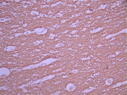 IHC image of CSB-RA805422A0HU diluted at 1:100 and staining in paraffin-embedded human brain tissue performed on a Leica BondTM system. After dewaxing and hydration, antigen retrieval was mediated by high pressure in a citrate buffer (pH 6.0). Section was blocked with 10% normal goat serum 30min at RT. Then primary antibody (1% BSA) was incubated at 4°C overnight. The primary is detected by a Goat anti-rabbit polymer IgG labeled by HRP and visualized using 0.05% DAB.