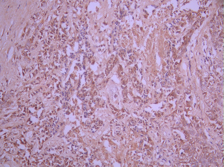IHC image of CSB-RA805422A0HU diluted at 1:100 and staining in paraffin-embedded human breast cancer performed on a Leica BondTM system. After dewaxing and hydration, antigen retrieval was mediated by high pressure in a citrate buffer (pH 6.0). Section was blocked with 10% normal goat serum 30min at RT. Then primary antibody (1% BSA) was incubated at 4°C overnight. The primary is detected by a Goat anti-rabbit polymer IgG labeled by HRP and visualized using 0.05% DAB.