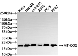 Positive WB detected in: HeLa whole cell lysate(30μg), HepG2 whole cell lysate(30μg), COLO205 whole cell lysate(30μg), A549 whole cell lysate, PC-3 whole cell lysate(30μg), K562 whole cell lysate(30μg)