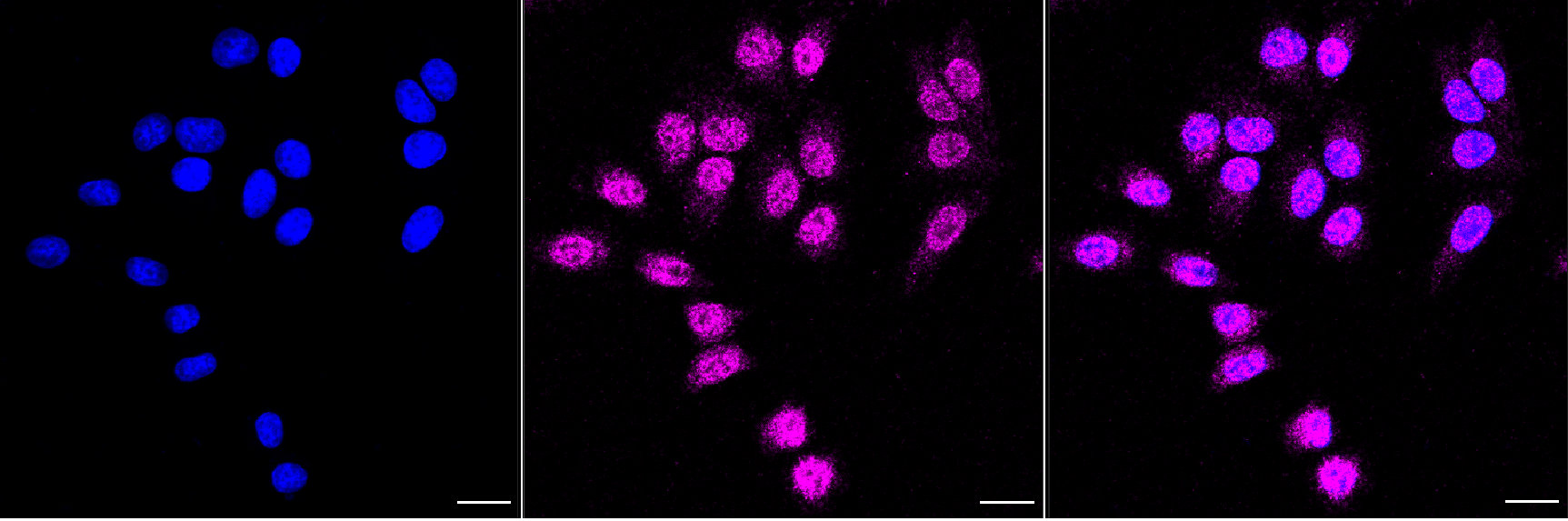 Immunocytochemical staining of HepG2 cells with mTOR antibody. Nuclei were stained blue with DAPI; mTOR was stained magenta with Alexa Fluor? 647. Images were taken using Leica stellaris 5. Protein abundance based on laser Intensity and smart gain: Medium. Scale bar, 20 μm.