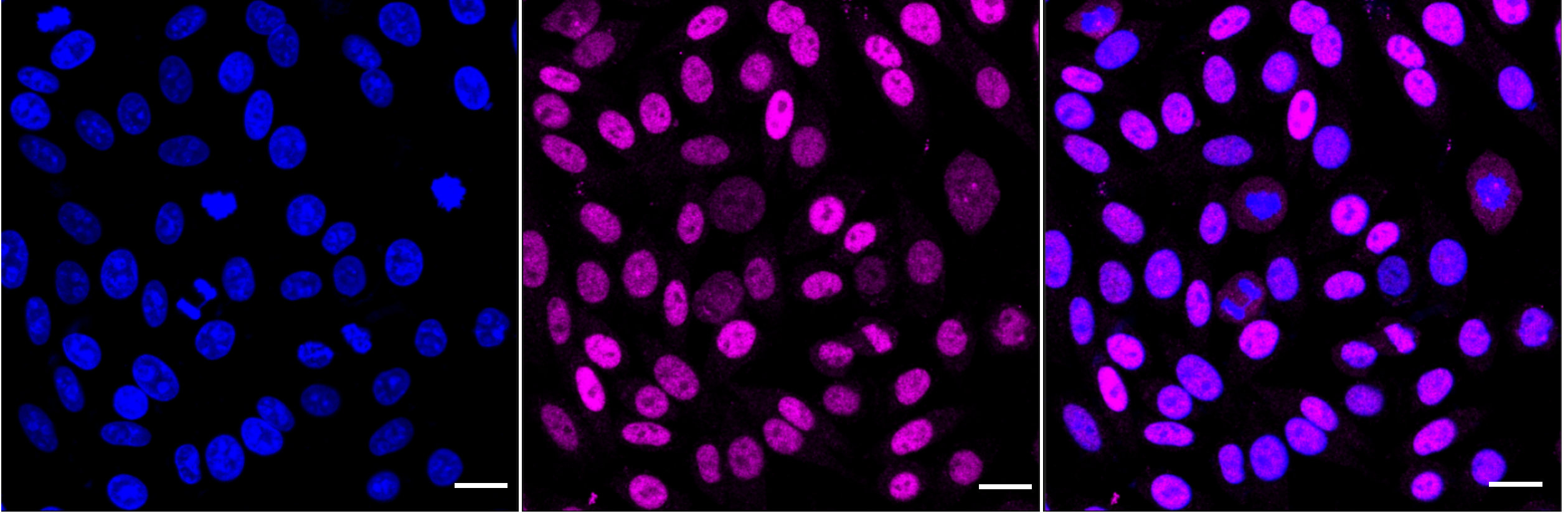 Immunocytochemical staining of HepG2 cells with c-Myc antibody. Nuclei were stained blue with DAPI; c-Myc was stained magenta with Alexa Fluor? 647. Images were taken using Leica stellaris 5. Protein abundance based on laser Intensity and smart gain: High. Scale bar: 20 μm.