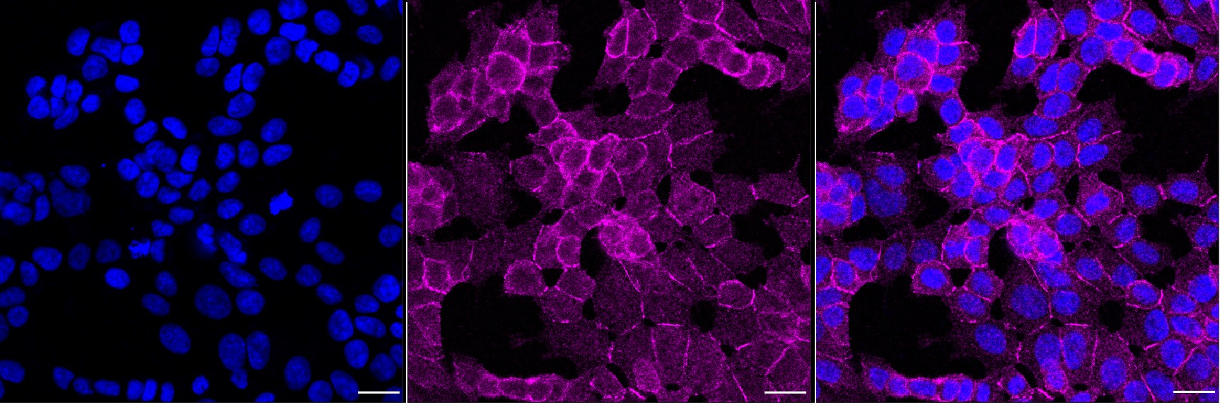 Immunocytochemical staining of HAP-1 cells with NF2 / Merlin antibody. Nuclei were stained blue with DAPI; NF2 / Merlin was stained magenta with Alexa Fluor? 647. Images were taken using Leica stellaris 5. Protein abundance based on laser Intensity and smart gain: Medium. Scale bar, 20 μm.
