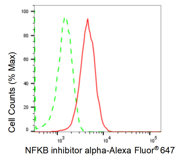 Flow cytometric analysis of NFKB inhibitor alpha expression in HepG2 cells using NFKB inhibitor alpha antibody. Green, isotype control; red, NFKB inhibitor alpha.