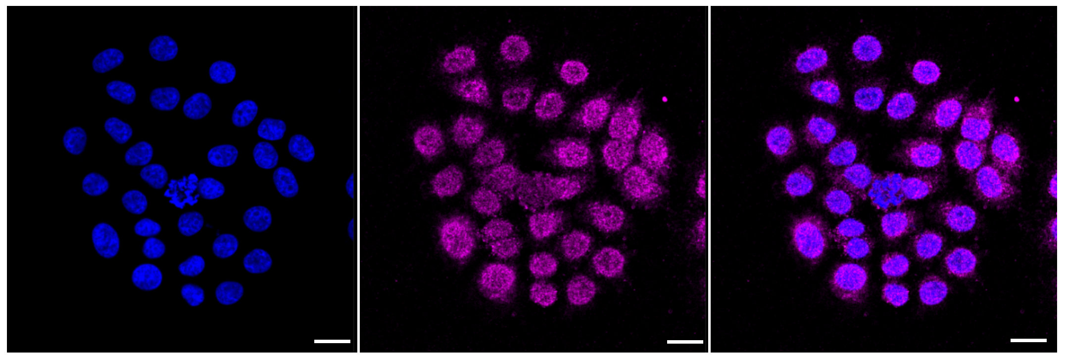 Immunocytochemical staining of HepG2 cells with NFKB inhibitor alpha antibody (4241, 1:1,000). Nuclei were stained blue with DAPI; NFKB inhibitor alpha was stained magenta with Alexa Fluor? 647. Images were taken using Leica stellaris 5. Protein abundance based on laser Intensity and smart gain: Low. Scale bar: 20 μm.