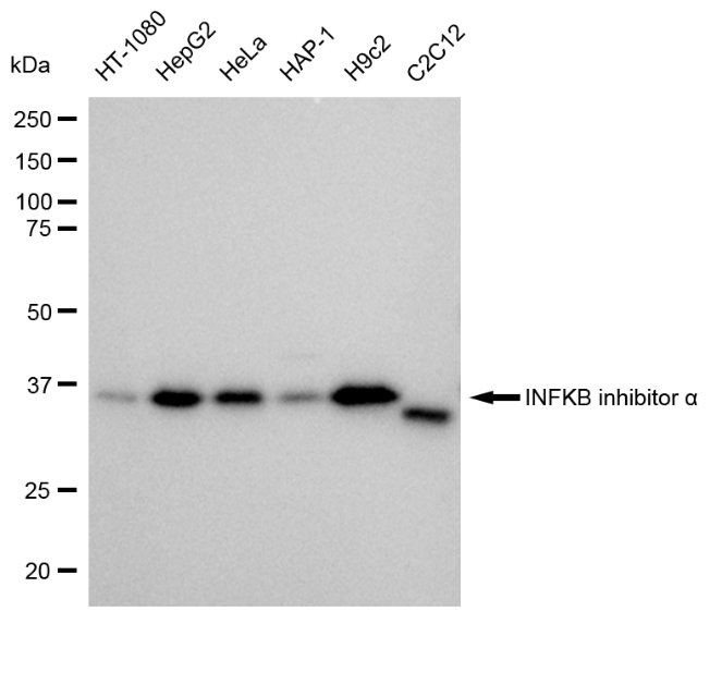 Western blotting analysis using NFKB inhibitor alpha antibody. Total cell lysates (30 μg) from various cell lines were loaded and separated by SDS-PAGE. The blot was incubated with NFKB inhibitor alpha antibody and HRP-conjugated goat anti-rabbit secondary antibody respectively.