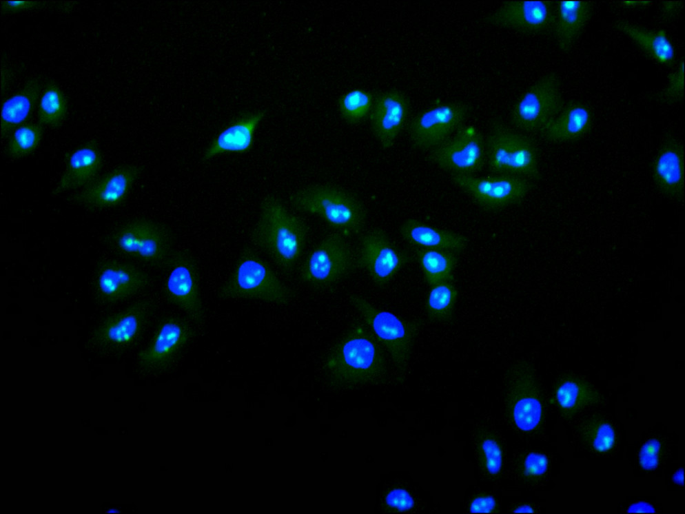 • Immunofluorescence staining of Hela cell with CSB-RA027798A0HU at 1:50 , counter-stained with DAPI. The cells were fixed in 4% formaldehyde, permeabilized using 0.2% Triton X-100 and blocked in 10% normal Goat Serum. The cells were then incubated with the antibody overnight at 4°C. The secondary antibody was Alexa Fluor 488-congugated AffiniPure Goat Anti-Rabbit IgG(H+L).
