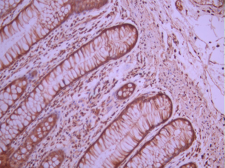 • IHC image of CSB-RA027798A0HU diluted at 1:100 and staining in paraffin-embedded human colorectal cancer performed on a Leica BondTM system. After dewaxing and hydration, antigen retrieval was mediated by high pressure in a citrate buffer (pH 6.0). Section was blocked with 10% normal goat serum 30min at RT. Then primary antibody (1% BSA) was incubated at 4°C overnight. The primary is detected by a Goat anti-rabbit polymer IgG labeled by HRP and visualized using 0.05% DAB.