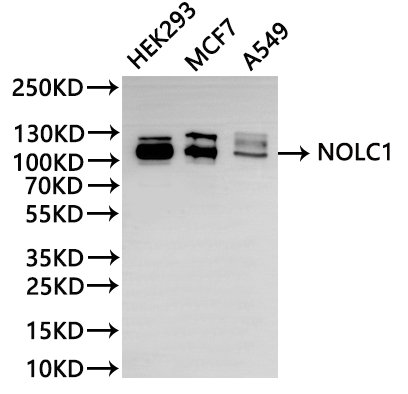 140 kDa nucleolar phosphoprotein antibody; HCV NS5A trans regulated protein 13 antibody; HCV NS5A transactivated protein 13 antibody; HCV NS5A-transactivated protein 13 antibody; Hepatitis C virus NS5A transactivated protein 13 antibody; Hepatitis C virus NS5A-transactivated protein 13 antibody; KIAA0035 antibody; NOLC 1 antibody; NOLC1 antibody; NOLC1_HUMAN antibody; NOPP 130 antibody; NOPP 140 antibody; NOPP130 antibody; Nopp140 antibody; NS5ATP13 antibody; Nucleolar 130 kDa protein antibody; Nucleolar and coiled body phosphoprotein 1 antibody; Nucleolar and coiled body phosphprotein 1 antibody; Nucleolar and coiled-body phosphoprotein 1 antibody; Nucleolar phosphoprotein p130 antibody; Nucleolar protein p130 antibody; P130 antibody