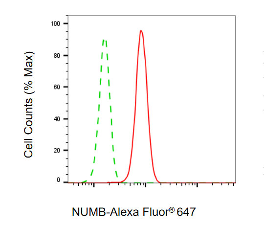 Flow cytometric analysis of NUMB expression in HepG2 cells using NUMB antibody. Green, isotype control; red, NUMB.