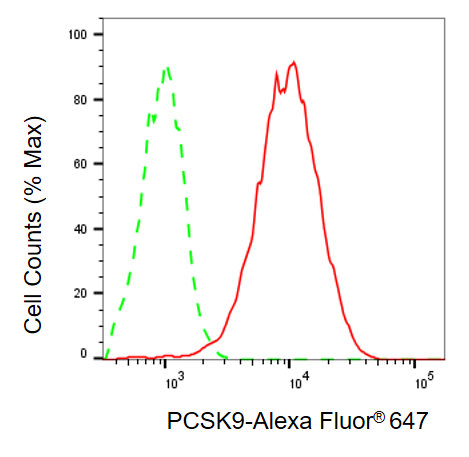 Flow cytometric analysis of PCSK9 expression in HepG2 cells using PCSK9 antibody. Green, isotype control; red, PCSK9.