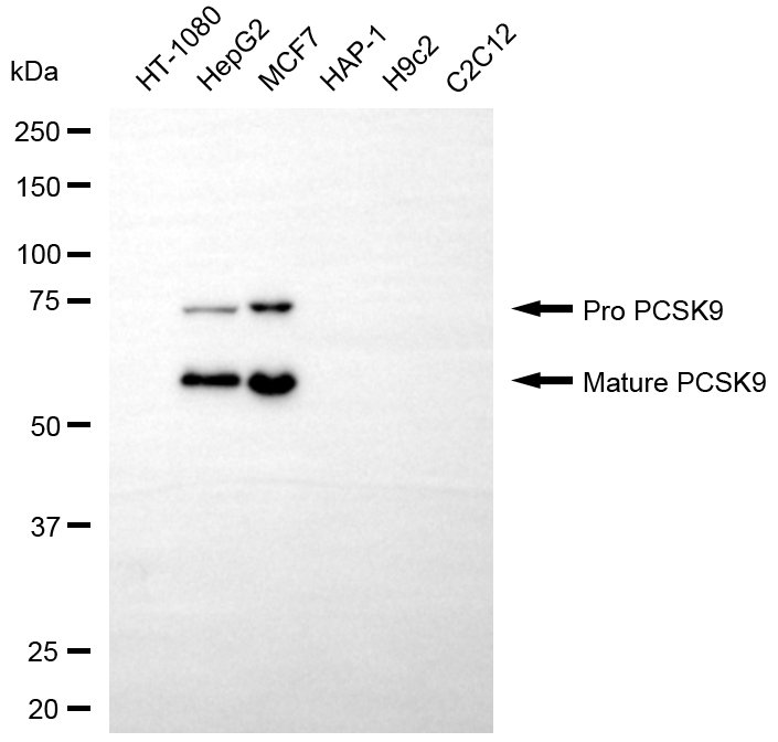 Western blotting analysis using PCSK9 antibody. Total cell lysates (30 μg) from various cell lines were loaded and separated by SDS-PAGE. The blot was incubated with PCSK9 antibody and HRP-conjugated goat anti-rabbit secondary antibody respectively.