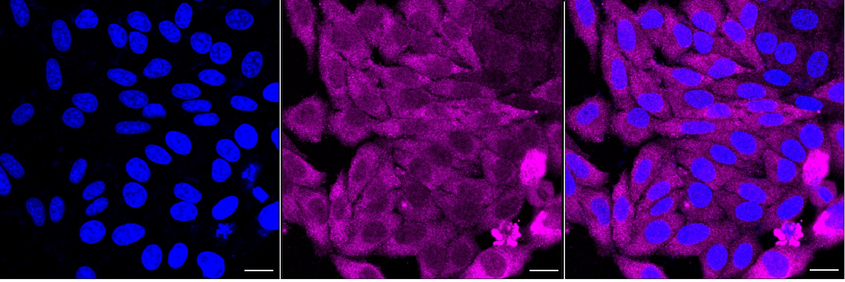 Immunocytochemical staining of HepG2 cells with Phosphoglycerate kinase 1 antibody. Nuclei were stained blue with DAPI; Phosphoglycerate kinase 1 was stained magenta with Alexa Fluor? 647. Images were taken using Leica stellaris 5. Protein abundance based on laser Intensity and smart gain: Medium. Scale bar, 20 μm.