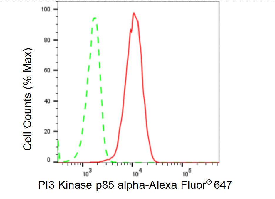 Flow cytometric analysis of PI3 Kinase p85 alpha expression in C2C12 cells using PI3 Kinase p85 alpha antibody. Green, isotype control; red, PI3 Kinase p85 alpha.
