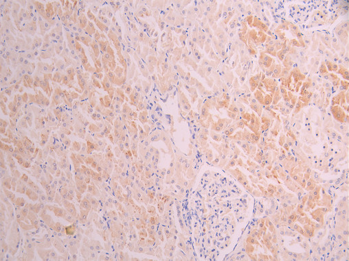 IHC image of CSB-RA130615A0HU diluted at 1:100 and staining in paraffin-embedded human kidney tissue performed on a Leica BondTM system. After dewaxing and hydration, antigen retrieval was mediated by high pressure in a citrate buffer (pH 6.0). Section was blocked with 10% normal goat serum 30min at RT. Then primary antibody (1% BSA) was incubated at 4°C overnight. The primary is detected by a Goat anti-rabbit polymer IgG labeled by HRP and visualized using 0.05% DAB.