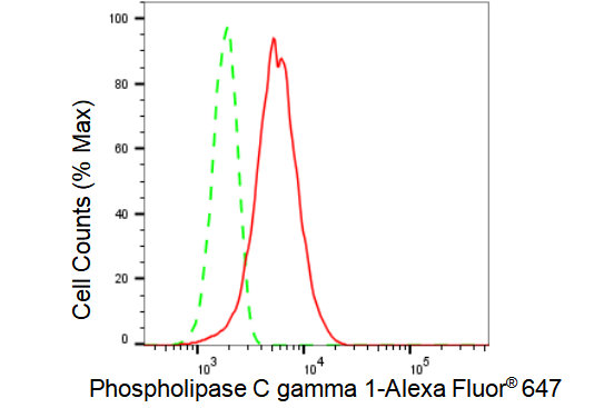 Flow cytometric analysis of Phospholipase C gamma 1 expression in HT-1080 cells using Phospholipase C gamma 1 antibody. Green, isotype control; red, Phospholipase C gamma 1.