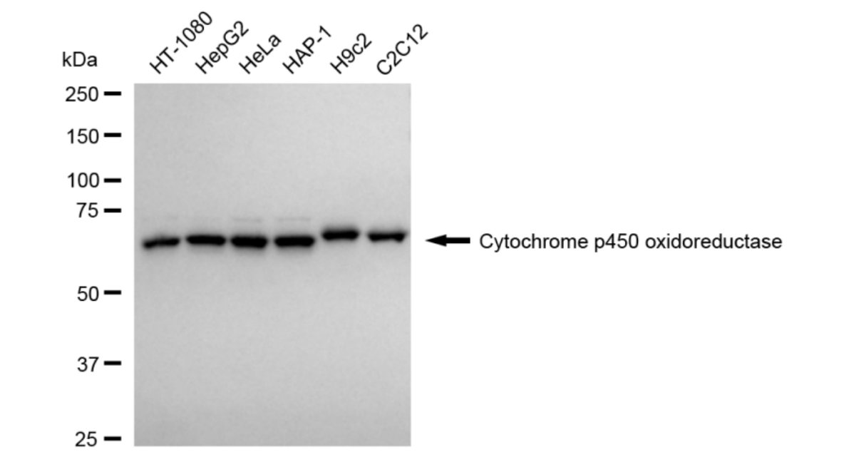 Western blotting analysis using cytochrome p450 oxidoreductase antibody. Total cell lysates (30 μg) from various cell lines were loaded and separated by SDS-PAGE. The blot was incubated with cytochrome p450 oxidoreductase antibody and HRP-conjugated goat anti-rabbit secondary antibody respectively.