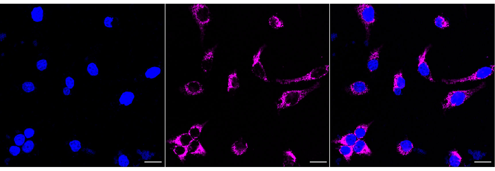 Immunocytochemical staining of Hela cells with peroxiredoxin 3 antibody. Nuclei were stained blue with DAPI; Peroxiredoxin 3 was stained magenta with Alexa Fluor? 647. Images were taken using Leica stellaris 5. Protein abundance based on laser Intensity and smart gain: Medium. Scale bar, 20 μm.