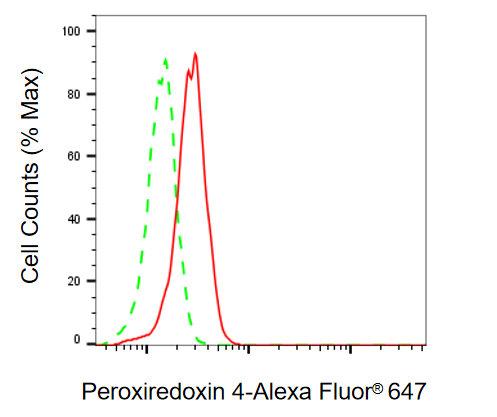 • Flow cytometric analysis of peroxiredoxin 4 expression in HAP-1 cells using peroxiredoxin 4 antibody. Green, isotype control; red, peroxiredoxin 4.