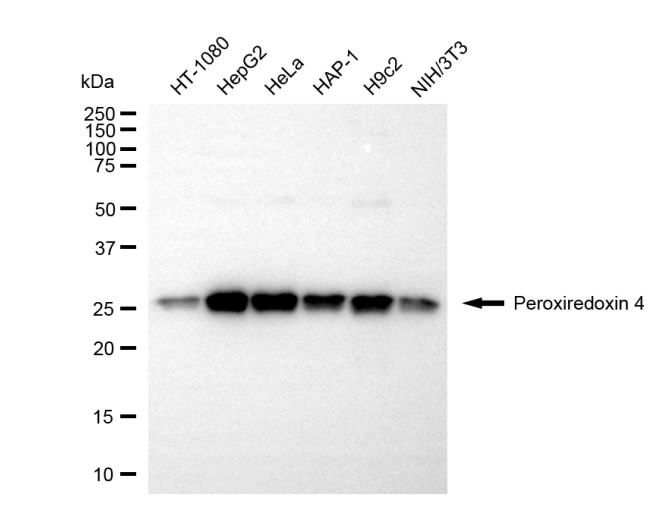 • Western blotting analysis using peroxiredoxin 4 antibody. Total cell lysates (30 μg) from various cell lines were loaded and separated by SDS-PAGE. The blot was incubated with peroxiredoxin 4 antibody and HRP-conjugated goat anti-rabbit secondary antibody respectively.