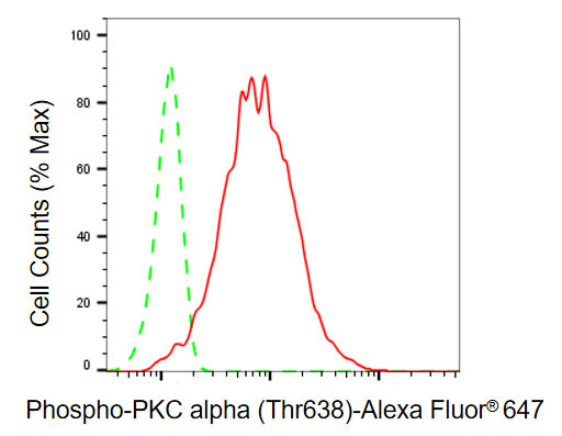 Flow cytometric analysis of phospho-PKC alpha (Thr638) expression in HepG2 cells using phospho-PKC alpha (Thr638) antibody. Green, isotype control; red, phospho-PKC alpha (Thr638).