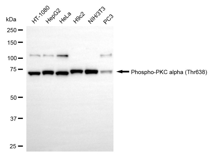 Western blotting analysis using phospho-PKC alpha (Thr638) antibody. Total cell lysates (30 μg) from various cell lines were loaded and separated by SDS-PAGE. The blot was incubated with phospho-PKC alpha (Thr638) antibody and HRP-conjugated goat anti-rabbit secondary antibody respectively.