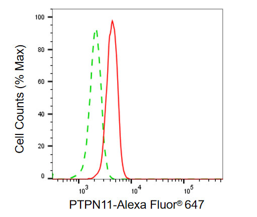 Flow cytometric analysis of PTPN11 expression in HepG2 cells using PTPN11 antibody. Green, isotype control; red, PTPN11.