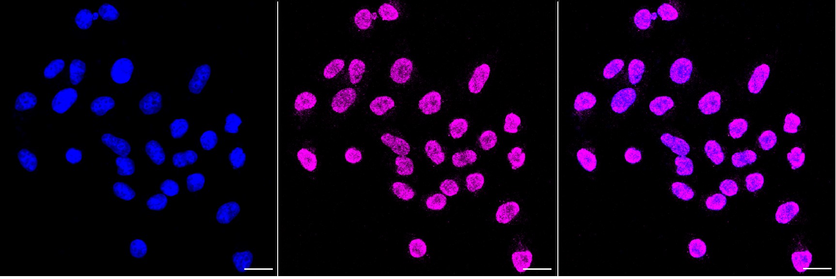 Immunocytochemical staining of HepG2 cells with PTPN11 antibody. Nuclei were stained blue with DAPI; PTPN11 was stained magenta with Alexa Fluor? 647. Images were taken using Leica stellaris 5. Protein abundance based on laser Intensity and smart gain: Medium. Scale bar, 20 μm.