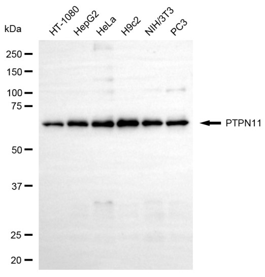 Western blotting analysis using PTPN11 antibody. Total cell lysates (30 μg) from various cell lines were loaded and separated by SDS-PAGE. The blot was incubated with PTPN11 antibody and HRP-conjugated goat anti-rabbit secondary antibody respectively.