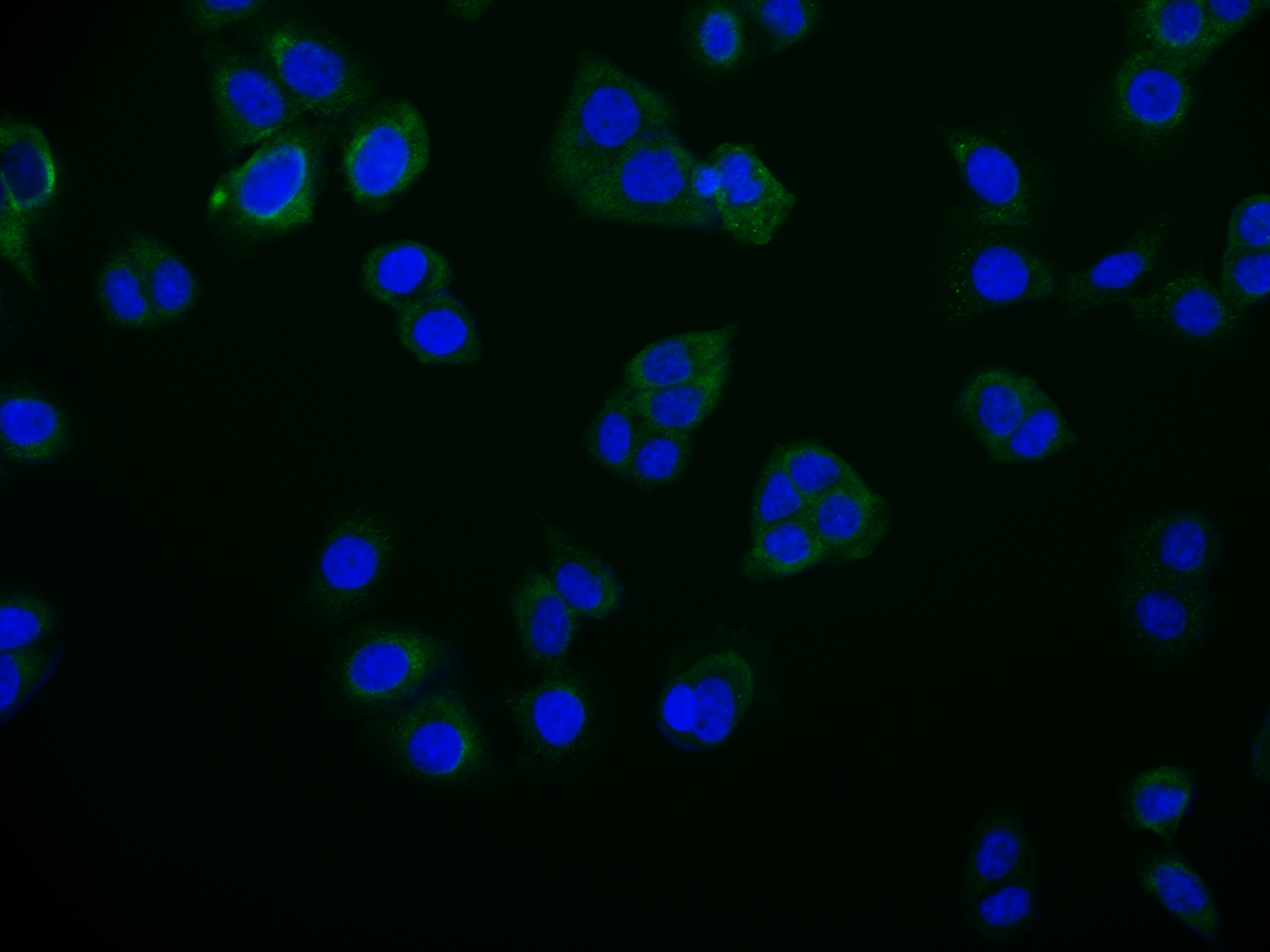• Immunofluorescence staining of PC-3 cell with CSB-RA284745A0HU at 1:50, counter-stained with DAPI. The cells were fixed in 4% formaldehyde and blocked in 10% normal Goat Serum. The cells were then incubated with the antibody overnight at 4°C. The secondary antibody was Alexa Fluor 516-congugated AffiniPure Goat Anti-Rabbit IgG(H+L).