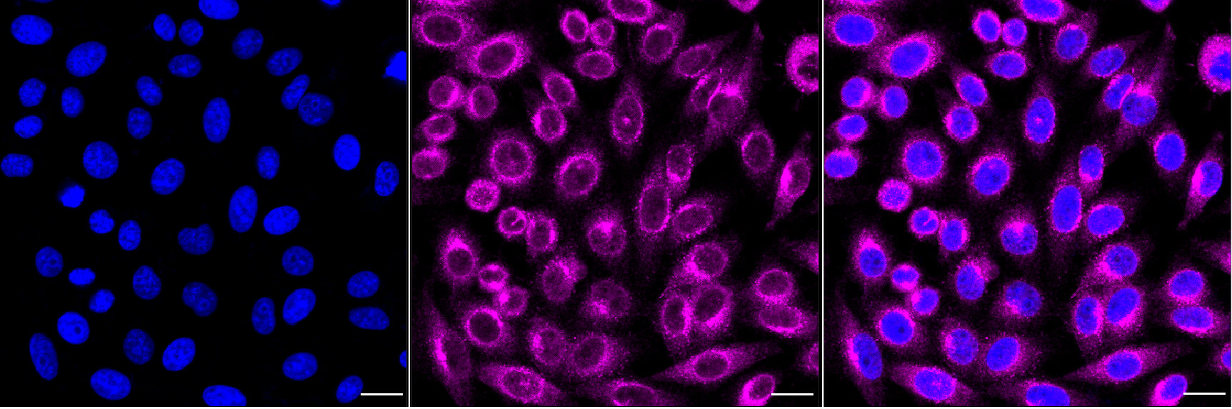Immunocytochemical staining of HepG2 cells with RAB5A antibody. Nuclei were stained blue with DAPI; RAB5A was stained magenta with Alexa Fluor? 647. Images were taken using Leica stellaris 5. Protein abundance based on laser Intensity and smart gain: Medium. Scale bar, 20 μm.