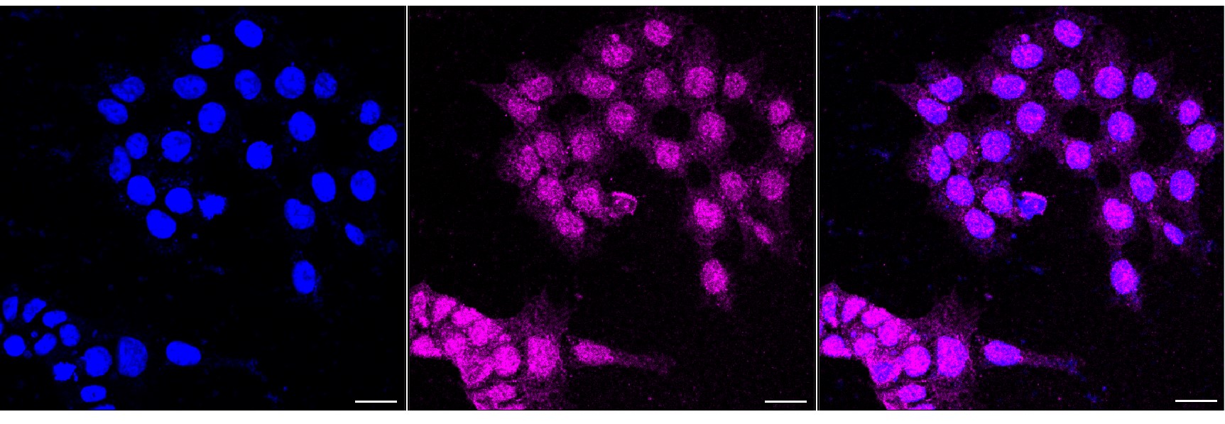 Immunocytochemical staining of HAP-1 cells with RAC3?antibody. Nuclei were stained blue with DAPI; RAC3?was stained magenta with Alexa Fluor? 647. Images were taken using Leica stellaris 5. Protein abundance based on laser Intensity and smart gain: Medium. Scale bar, 20 μm.