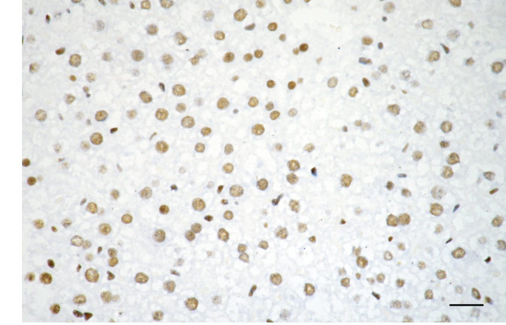 Immunohistochemistry was performed on paraffin-embedded mouse liver using RBBP4 antibody. Antigen retrieval was done in sodium citrate buffer (pH 6.0). DAB was used for detection, with hematoxylin counterstaining. Images were acquired using a Nikon Ci-L Plus microscope (40× objective). Scale bar: 25 μm.