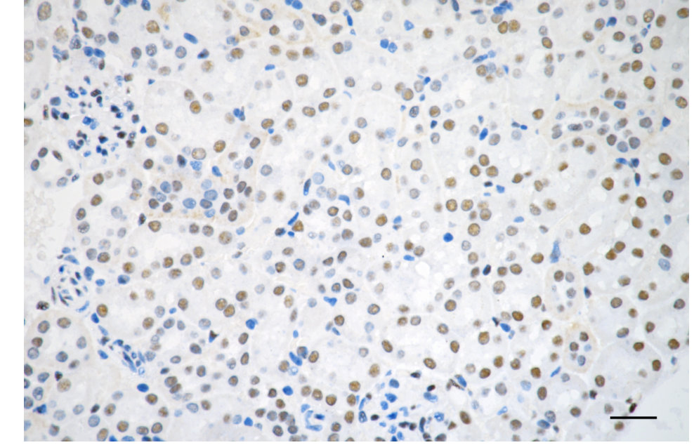 Immunohistochemistry was performed on paraffin-embedded mouse kidney using RBBP4 antibody. Antigen retrieval was done in sodium citrate buffer (pH 6.0). DAB was used for detection, with hematoxylin counterstaining. Images were acquired using a Nikon Ci-L Plus microscope (40× objective). Scale bar: 25 μm.