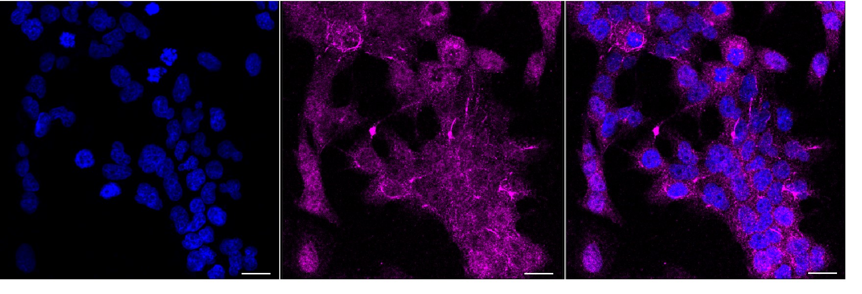 Immunocytochemical staining of HeLa cells with phospho-RSK1(S380) antibody. Nuclei were stained blue with DAPI; Phospho-RSK1(S380) was stained magenta with Alexa Fluor? 647. Images were taken using Leica stellaris 5. Protein abundance based on laser Intensity and smart gain: Medium. Scale bar, 20 μm.