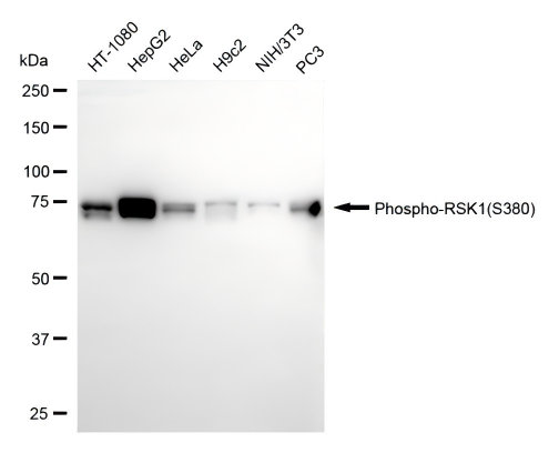 Western blotting analysis using phospho-RSK1 (S380) antibody. Total cell lysates (30 μg) from various cell lines were loaded and separated by SDS-PAGE. The blot was incubated with phospho-RSK1 (S380) antibody and HRP-conjugated goat anti-rabbit secondary antibody respectively.