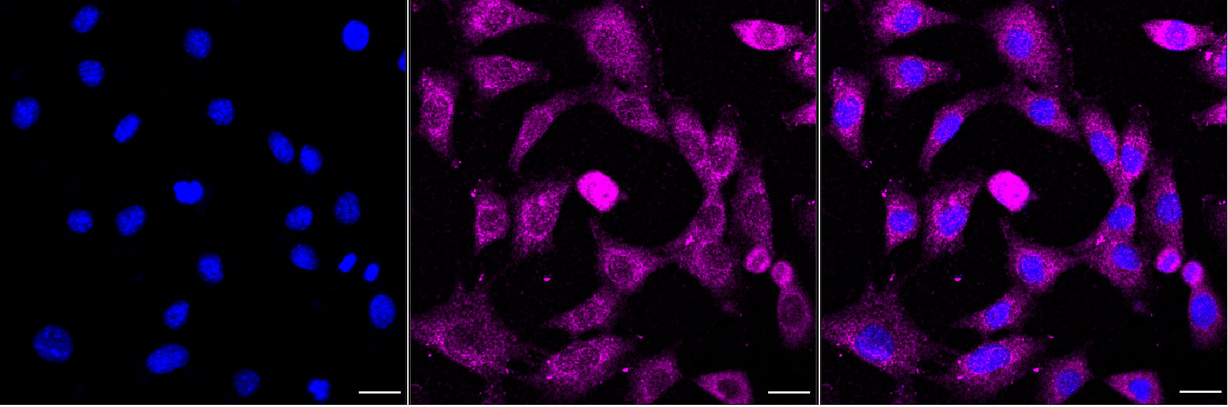 Immunocytochemical staining of C2C12 cells with solute carrier family 25 member 12 antibody. Nuclei were stained blue with DAPI; Solute carrier family 25 member 12 was stained magenta with Alexa Fluor? 647. Images were taken using Leica stellaris 5. Protein abundance based on laser Intensity and smart gain: Medium. Scale bar, 20 μm.