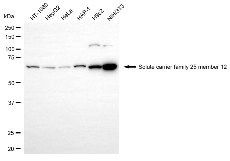 Western blotting analysis using solute carrier family 25 member 12 antibody. Total cell lysates (30 μg) from various cell lines were loaded and separated by SDS-PAGE. The blot was incubated with solute carrier family 25 member 12 antibody and HRP-conjugated goat anti-rabbit secondary antibody respectively.