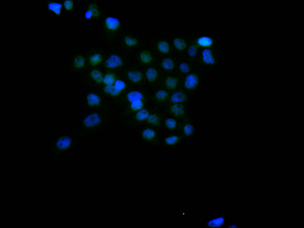 Immunofluorescence staining of A431 cell with CSB-RA966408A0HU at 1:50, counter-stained with DAPI. The cells were fixed in 4% formaldehyde, permeabilized using 0.2% Triton X-100 and blocked in 10% normal Goat Serum. The cells were then incubated with the antibody overnight at 4°C. The secondary antibody was Alexa Fluor 488-congugated AffiniPure Goat Anti-Rabbit IgG(H+L).