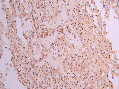IHC image of CSB-RA966408A0HU diluted at 1:100 and staining in paraffin-embedded human glioma cancer performed on a Leica BondTM system. After dewaxing and hydration, antigen retrieval was mediated by high pressure in a citrate buffer (pH 6.0). Section was blocked with 10% normal goat serum 30min at RT. Then primary antibody (1% BSA) was incubated at 4°C overnight. The primary is detected by a Goat anti-rabbit polymer IgG labeled by HRP and visualized using 0.05% DAB.