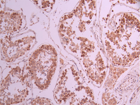 IHC image of CSB-RA966408A0HU diluted at 1:100 and staining in paraffin-embedded human testis tissue performed on a Leica BondTM system. After dewaxing and hydration, antigen retrieval was mediated by high pressure in a citrate buffer (pH 6.0). Section was blocked with 10% normal goat serum 30min at RT. Then primary antibody (1% BSA) was incubated at 4°C overnight. The primary is detected by a Goat anti-rabbit polymer IgG labeled by HRP and visualized using 0.05% DAB.