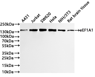 Positive WB detected in:A431 whole cell lysate(30μg), Jurkat whole cell lysate(30μg), SW620 whole cell lysate(30μg), Hela whole cell lysate(30μg), NIH/3T3 whole cell lysate(30μg), Rat brain tissue lysate(30μg)