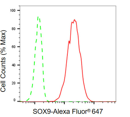 • Flow cytometric analysis of SOX9 expression in HT-1080 cells using SOX9 antibody. Green, isotype control; red, SOX9.